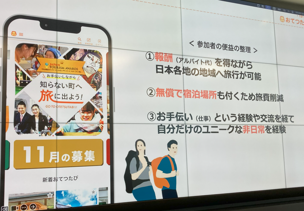 事業の特徴は会社名そのもので、お手伝い(仕事)✖ 旅 = 「おてつたび」。
