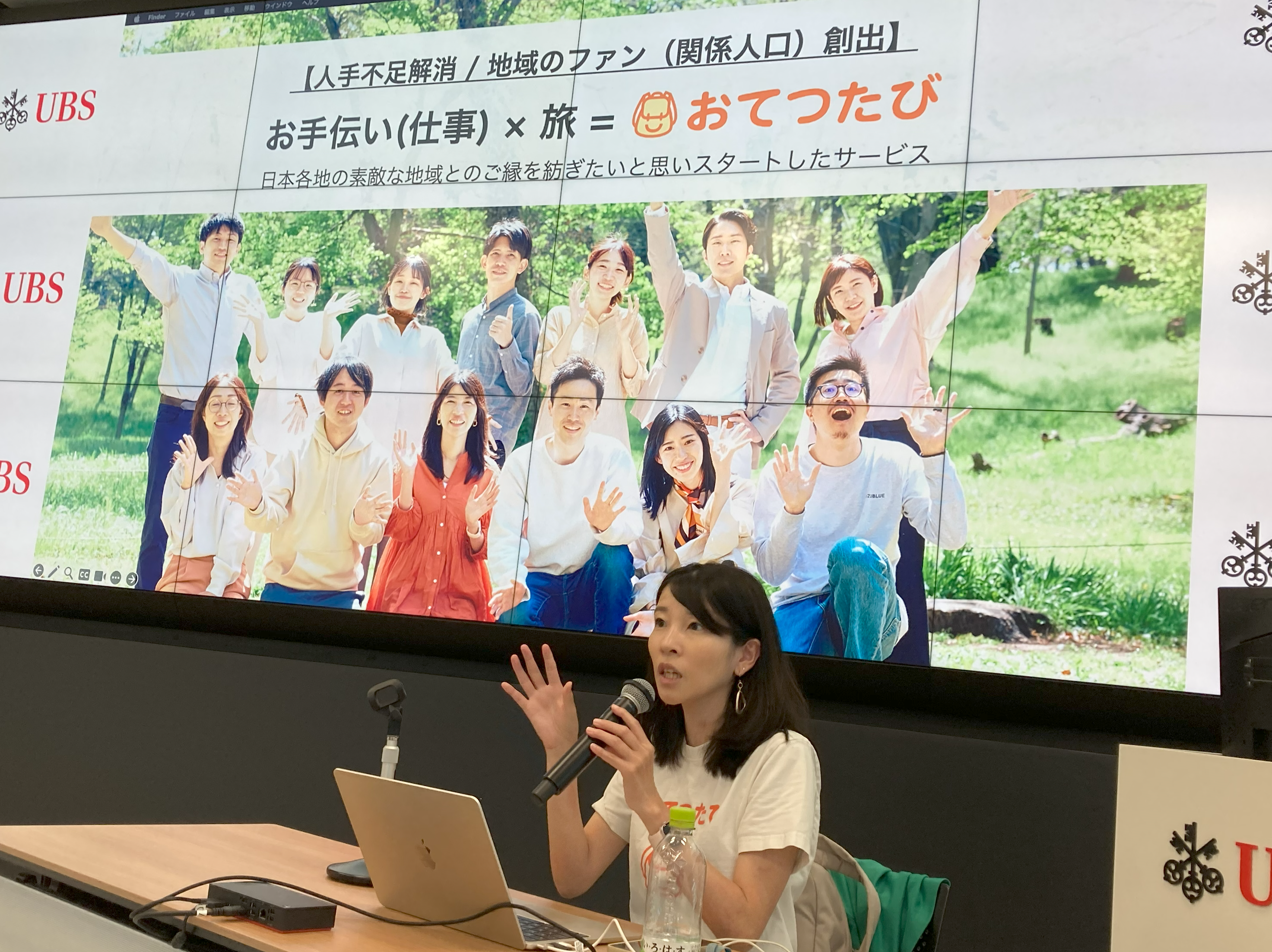 9月26日、東京・大手町にあるUBSグループのオフィスで開かれたイベントに、SVP東京の投資・協働先である株式会社おてつたびの永岡里菜代表が登壇。UBSグループ社員有志とSVP東京パートナーなど計12名が参加し、取り組む社会課題について議論しました。