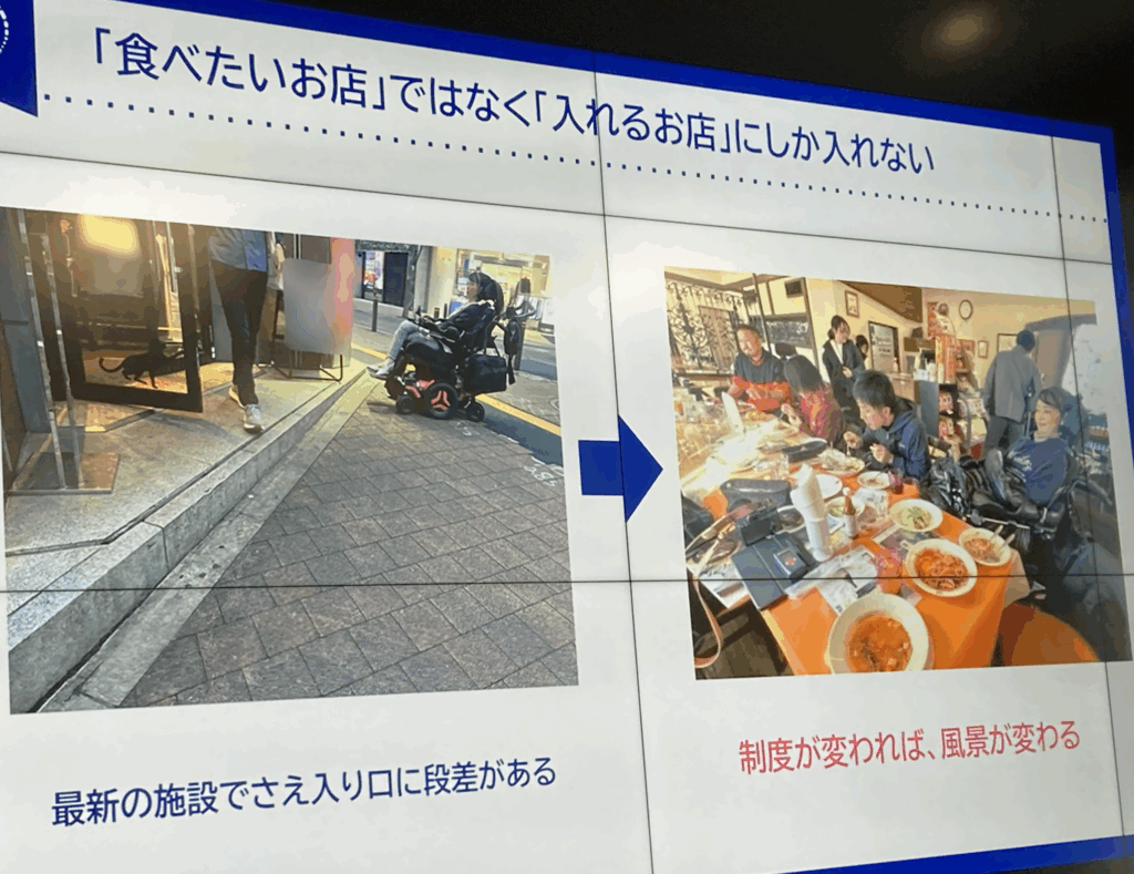また、パスタの有名店の協力を得て、車いすでも行くことができたお店の事例を紹介するなど、制度が変わることの意義を発信しています。