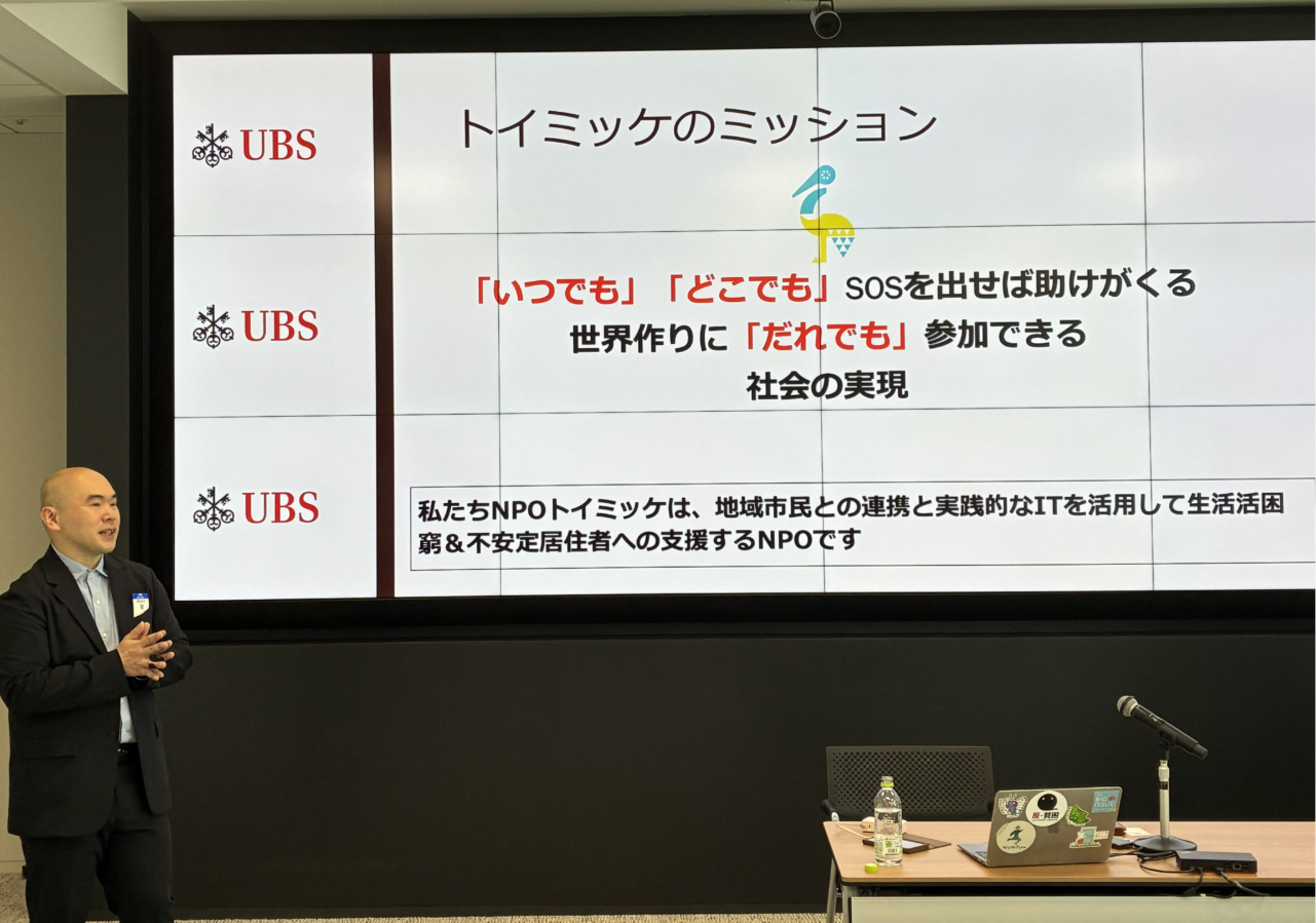 4月17日、東京・大手町にあるUBSグループのオフィスで開かれたイベントに、SVP東京の投資・協働先であるNPO法人トイミッケの佐々木大志郎代表が登壇。UBSグループ社員有志とSVP東京パートナーの計9名が参加し、取り組む社会課題について議論しました。