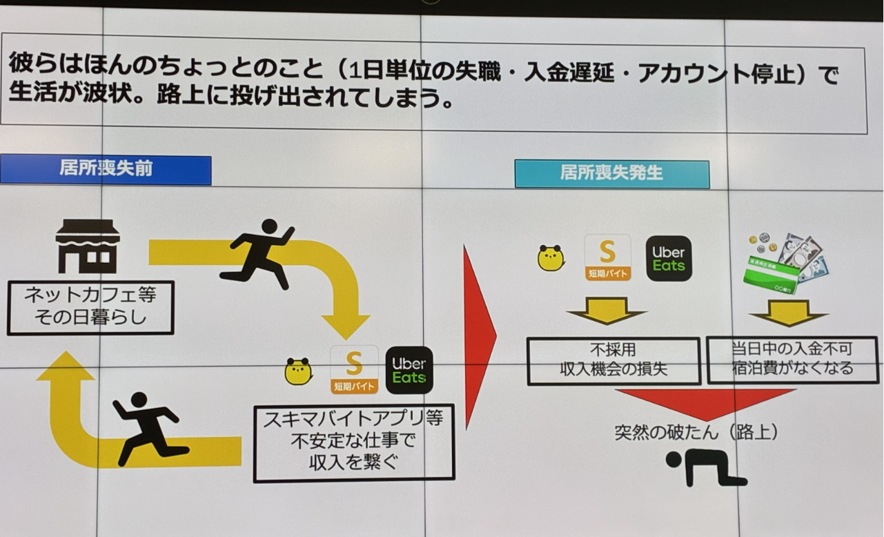 佐々木さんのプレゼンは、「見えないホームレス」の話から始まりました。「ホームレス」というと、路上に寝ている人をイメージすることが多いと思いますが、最近増えているのは、それとは違って、スキマバイトなどで不安定ながらも収入があり、ネットカフェなどに宿泊してその日暮らしをしている層です。