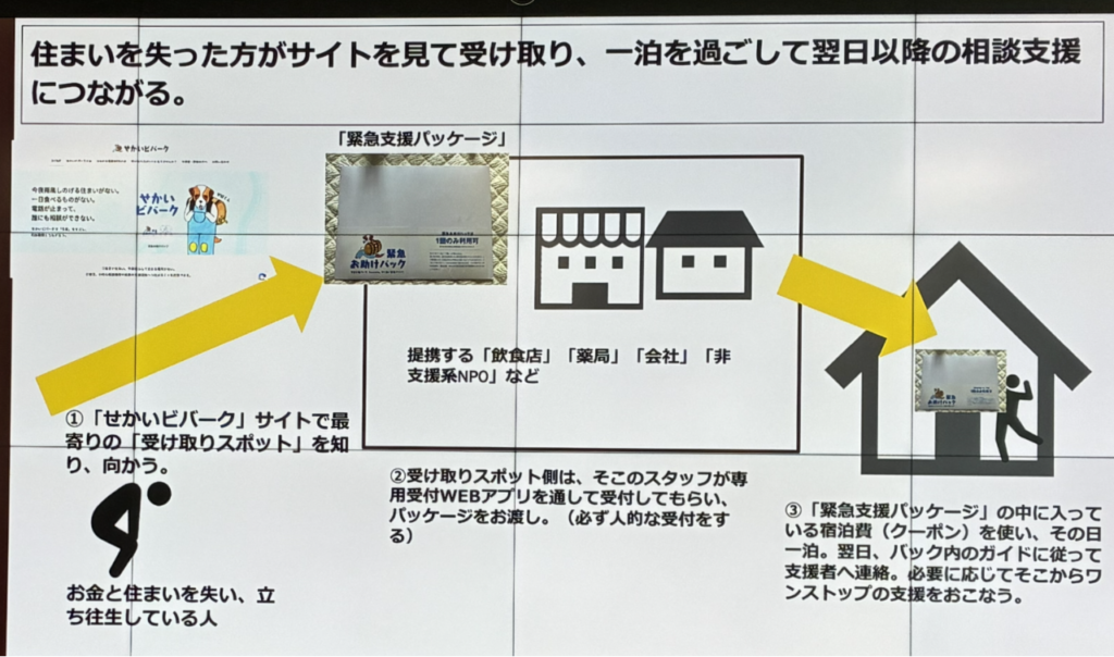 「せかいビバーク」と名付けたサイトで、「緊急支援パッケージ」を受け取れる場所を探してもらい、専用のアプリに登録してもらった上で、渡します。